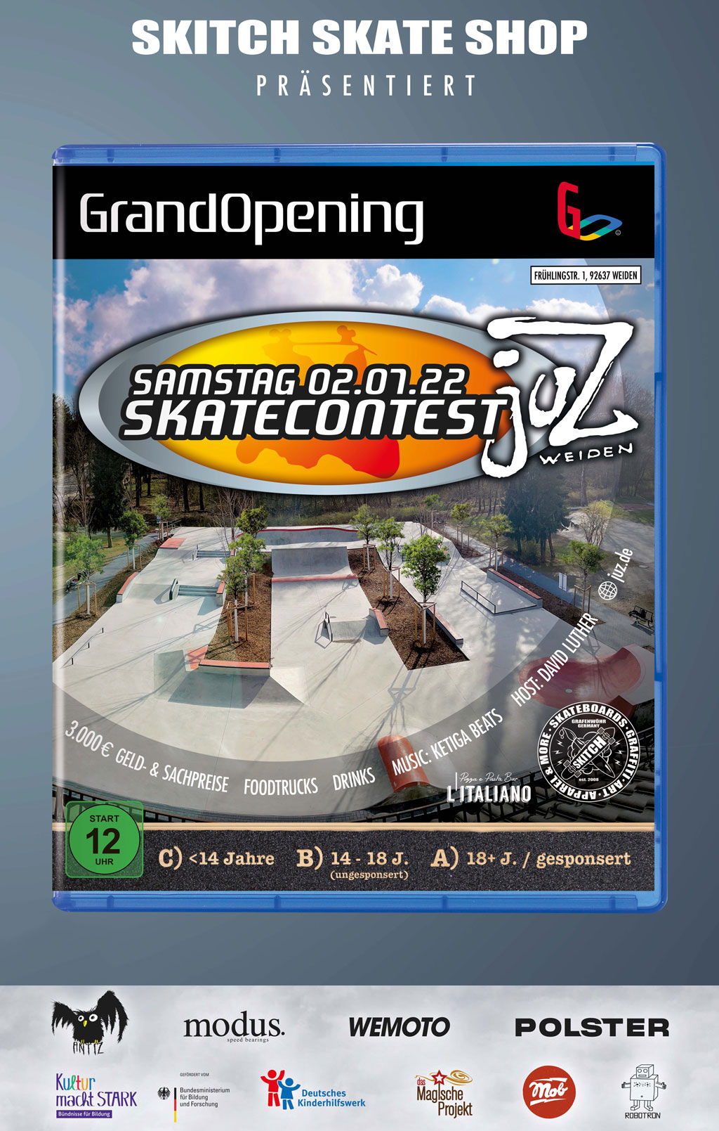 Hallo liebe Menschen, wir freuen uns, Sie zur 2. jährlichen Weiden Skate Competition einzuladen! Die Veranstaltung findet am 27. Mai im JUZ Weiden statt. Die Adresse lautet Frühlingstraße 1, 92637 Weiden in der Oberpfalz. Die Anmeldegebühr für alle teilnehmenden Athleten beträgt jeweils 10 Euro. Die Athleten können sich im SKITCH Pavilion anmelden, der sich neben der DJ-Kabine befindet. Die Anmeldung für jede Gruppe endet 30 Minuten vor dem Start dieser Gruppe. Sie müssen persönlich im Park sein, um sich anzumelden, Ihre Freunde dürfen Sie nicht anmelden. Athleten sollten bitte eine Stunde vor Beginn ihrer Gruppe im Park sein, falls es leichte Veränderungen im Zeitplan gibt. Laden Sie hier das Anmeldeformular herunter und bringen Sie es zur Veranstaltung mit. Alle SkaterInnen unter 18 Jahren müssen eine Unterschrift der Eltern/Erziehungsberechtigten vorweisen.